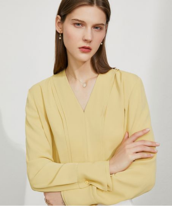 Vラインのデザインが顔まわりをすっきりと見せ、きれい色を大人らしく楽しめるブラウス。落ち感のある素材がやわらかな印象をつくり、体型をさりげなくカバーしてくれます。ジャケットのインナーとしても使いやすく、きちんと感が欲しいお出かけにも活躍します。