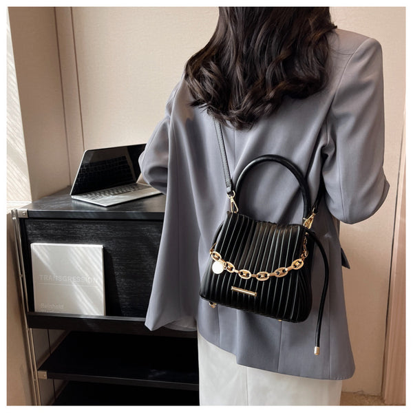 煌びやかな大ぶりのチェーンも魅力ですが、全体にあしらわれたプリーツが技アリなバッグ。光の加減でストライプ柄のように見えるのもユニークですね。フォルムやサイズ感はキュートながらも、縦のラインがスマートにも魅せてくれ、パンツなどハンサムコーデとも好相性です。