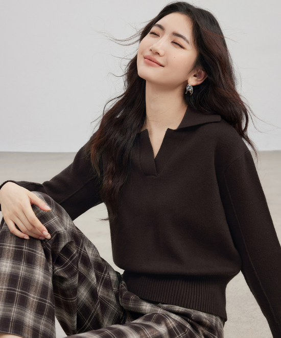 コーヒーカラーのニットトップス。Vネックがデコルテをきれいに見せてくれます。締め付けなく、ゆったりとした着用感。
