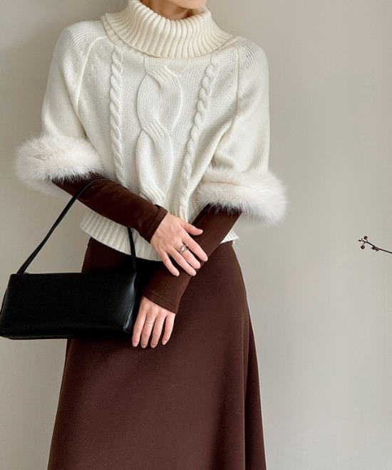 ホワイトカラーのファー付きニット。ケーブル柄が温かみを演出してくれます。ブラウンのインナーを着て、エレガントにコーディネート。