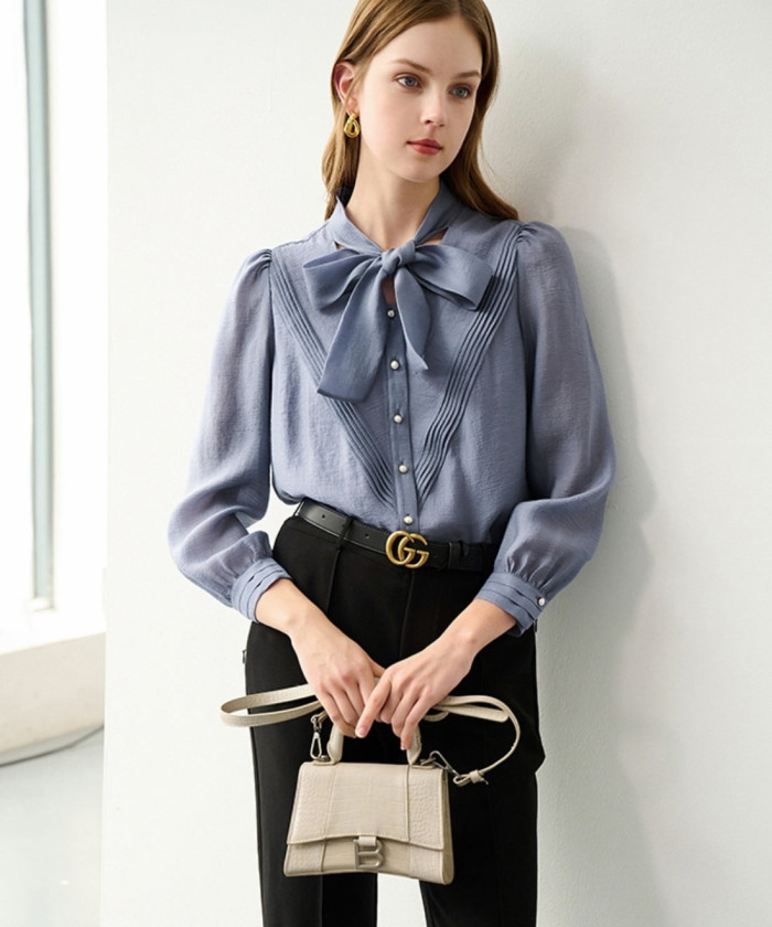 やさしいカラーと艶のある素材感で大人きれいな雰囲気を演出。どんなボトムスとも相性抜群のシンプルなボウタイブラウスは、1枚持っておくと心強いアイテムです。