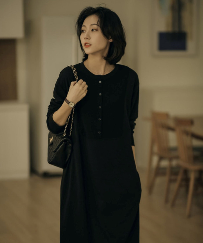 フロントボタンデザインのニットワンピースは、シンプルながら一枚で着映えする頼れる存在。ブラックを選べば甘さを抑えた大人っぽい印象に仕上がり、忙しい日でもさっと着るだけでコーデが完成します。きれいめにもカジュアルにも使える、デイリーに活躍する優秀ワンピースです。