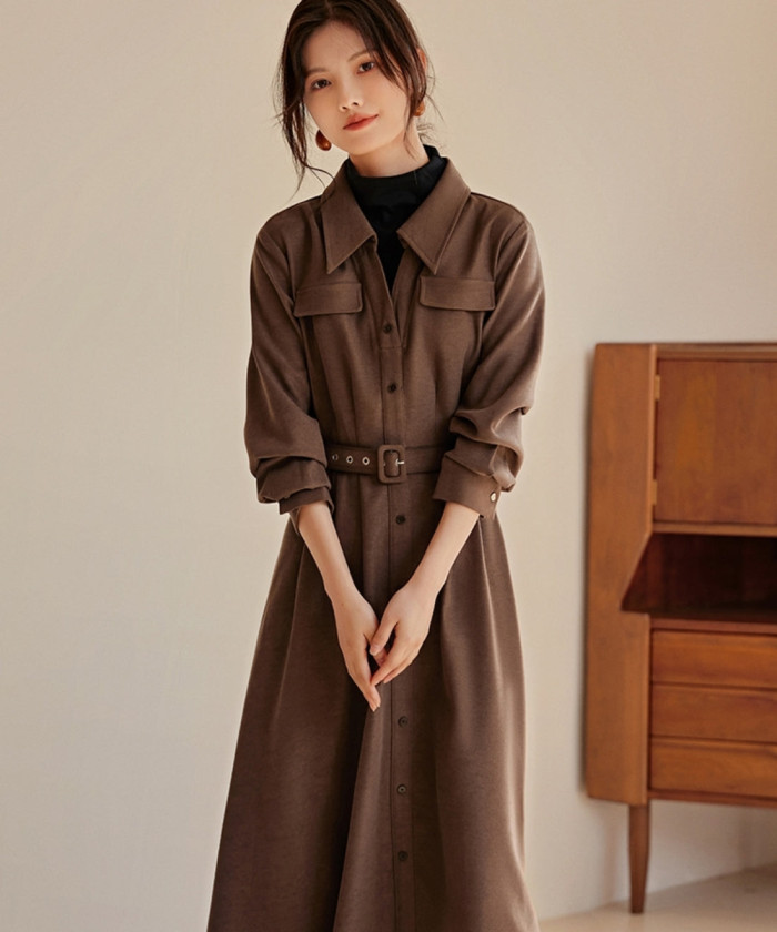 ウエストベルト付きのシャツワンピースは、トレンド感のあるブラウンカラーで大人の着こなしに自然と馴染む一枚。Aラインシルエットが体型をさりげなくカバーし、きれいめにもカジュアルにも着回しやすいのが魅力です。シンプルなデザインだからこそ、合わせる小物次第で印象を変えられる万能ワンピース。