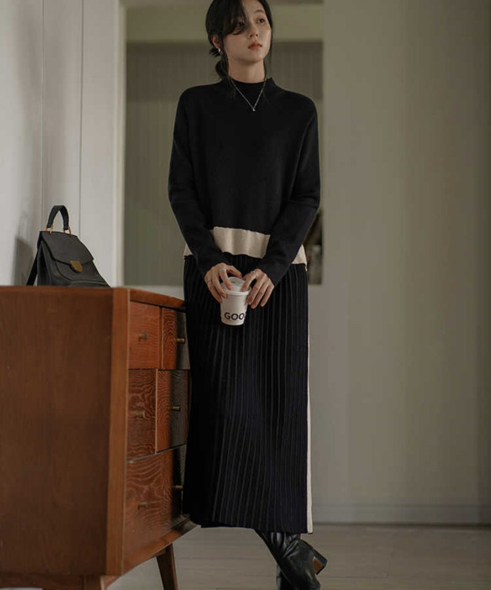 ハーフタートルデザインのニットワンピースは、切り替えプリーツがふんわりと揺れて女性らしい印象に。ブラックをベースにホワイトのラインが映え、モノトーンでも重たく見えません。きれいめにもカジュアルにも着回せる、大人にちょうどいい一着です。