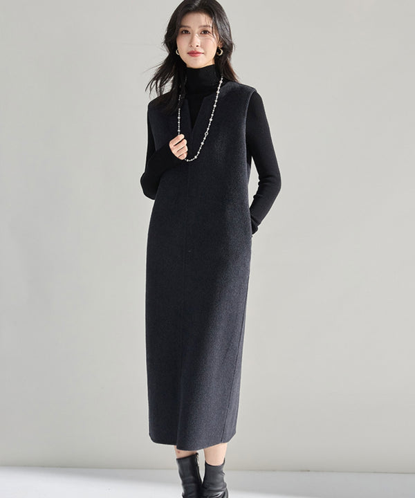 ウール素材のノースリーブロングワンピースは、ストレートシルエットですっきりとした印象に。ダークトーンでまとめたインナーとのワントーンコーデが統一感を生み、落ち着いた大人スタイルが完成します。コーデ次第で印象を切り替えられる一着。