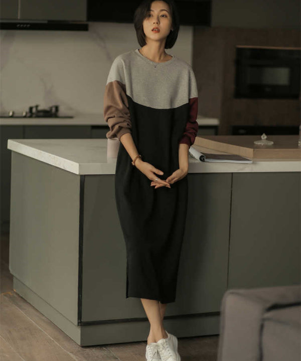 トリプルカラーの配色が目を引くスウェットワンピースは、ロング丈でも部屋着っぽく見えないのが魅力。配色デザインが縦ラインを強調し、自然とスタイルアップを叶えます。ラクな着心地ながら今っぽさもあり、デイリーに取り入れやすい大人向けワンピースです。