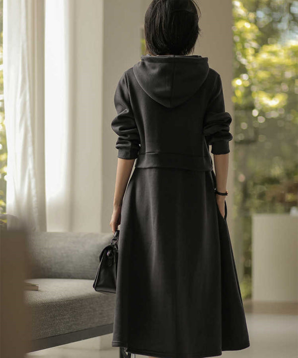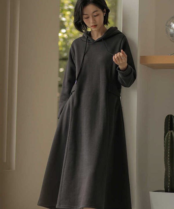 やわらかなスウェット素材にゆとりを持たせたサイズ感で着心地抜群のワンピース。背中部分に切り替えを入れることで程よく引き締まり、ラフに見えても部屋着っぽくならないのが嬉しいですね。カーディガンやアウターの首元からフードを出したスタイルでよそ行きにも。