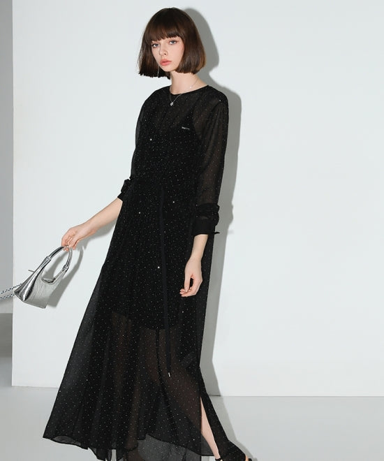 露出を控えたデザインながらもシアー素材でさりげなく肌見せ。華やかさはありつつも、女っぽくなり過ぎず上品な仕上がりです。ドット柄に、ビジューをランダムにあしらうことで冬の夜空を演出。ホテルディナーにはもちろん、ナイトシーンにも映える1枚に。