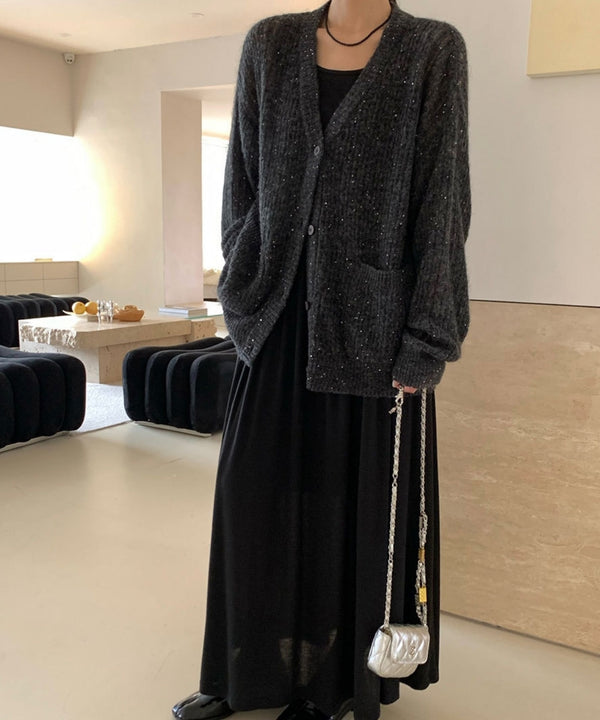 定番のVネックカーディガンながらも、ゆるっと大きめのサイズ感に大人の余裕が漂うこちら。ランダムに散りばめられたスパンコールが華やかですが、どこか日常っぽさを残し、こなれて見えます。ルーズには見せない、でもブラックよりは堅くないダークグレーが絶妙。