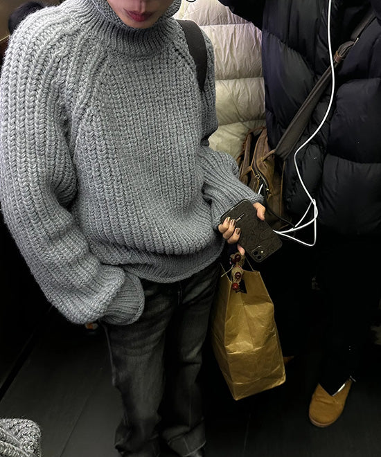 ざっくり編みのセーターと言えばほっこりしがちですが、こちらは大きめのサイズに厚みも加わって雰囲気たっぷり。無機質なグレーの色味と相まってワイルドな仕上がりに。ダメージデニムを合わせたストリート系の着こなしも素敵ですが、レザーパンツも合いそうです。