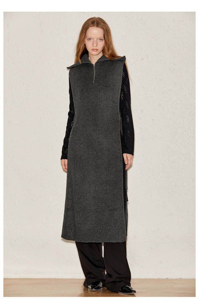 ヒップラインまで覆うロング丈が、体のラインをやさしく包み込みながら縦のシルエットを強調してくれる一枚。シャツやカットソーの上に重ねるだけで、シンプルな装いも落ち着いた大人バランスに整います。パンツスタイルはもちろん、ワンピースとのレイヤードにも使いやすいデザインです。