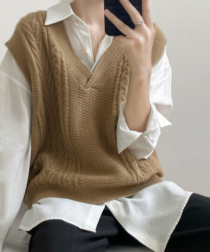 程よく立体感のあるケーブル編みとVネックの組み合わせが、コーデ全体をすっきり見せてくれるニットベスト。シャツやブラウスと合わせることで、きれいめな印象も自然にプラスできます。カジュアルになりすぎず、通勤やきちんとしたシーンにも取り入れやすい一枚です。