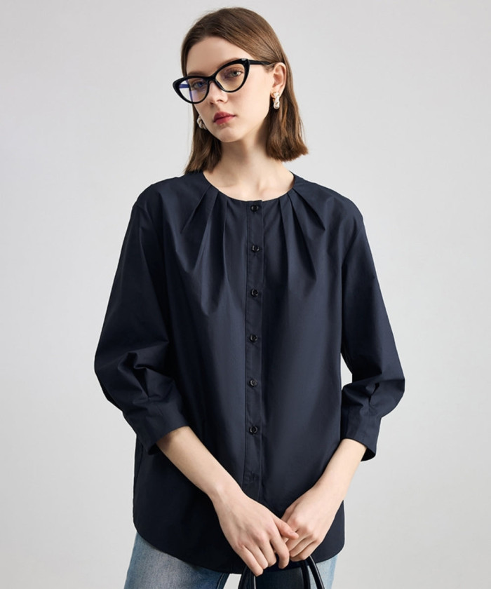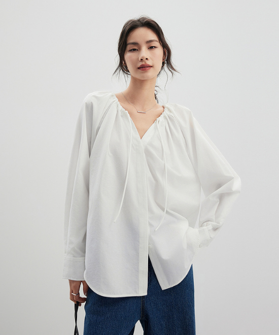 ドローストリング仕様のネックデザインが、顔まわりにやさしい動きを添えるシャツ。きちんと感がありながら、締めつけすぎない首元が大人の余裕を感じさせます。ボトムを選ばず合わせやすく、シンプルなコーディネートでも自然と表情が生まれる一枚です。