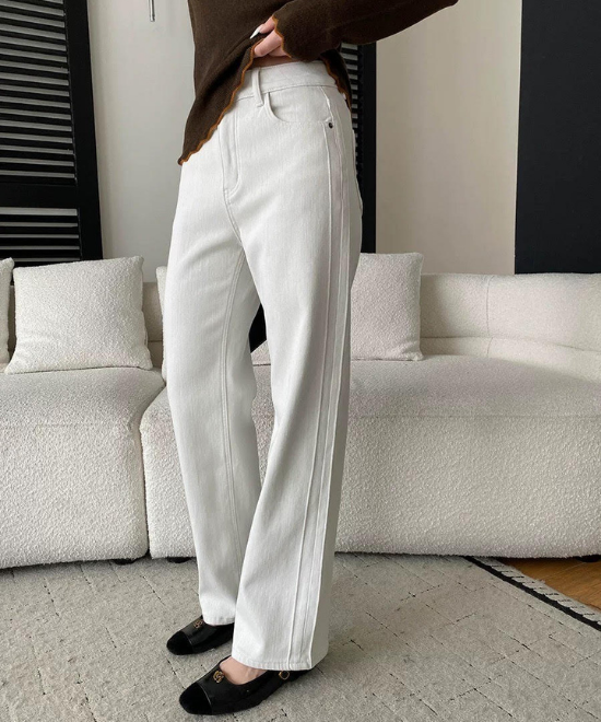 ハイウエストのホワイトデニムは、ウエスト位置を高く見せて脚を長く見せる効果がある一本。黒やグレーの厚手トップスを合わせても、白が視線を引き上げて重たさを払拭してくれます。ストレートラインながらもきれいなシルエットで、冬の重ね着コーデに軽やかな印象をプラスします。