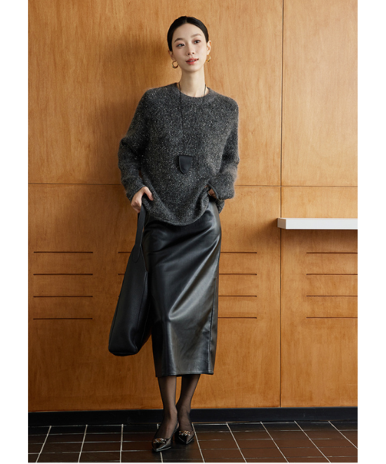 モヘアウール素材のルーズシルエットセーターは、包み込むような着心地でリラクシーな雰囲気を演出。ダークグレーをベースにダークトーンでまとめれば、ラフになりすぎず大人っぽく仕上がります。抜け感がありながらも落ち着いた印象で、30代40代のデイリースタイルに取り入れやすい一枚です。