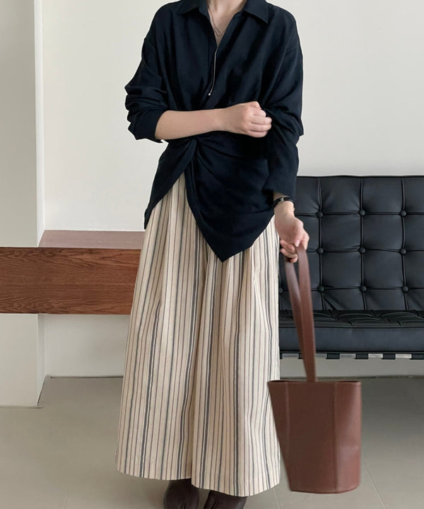 ウエストにひねりを効かせたデザインがアクセントになるネイビーの襟付きシャツ。一見シンプルながら、立体感のあるシルエットで着るだけで印象が変わります。きちんと感を保ちつつ程よい個性もプラスでき、オフィスにもデイリーにも活躍する一枚です。