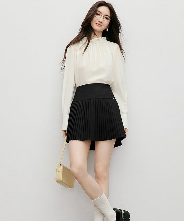ギャザーネックのベージュブラウスは、きれいめとカジュアル、どちらのテイストにも自然に馴染む30代40代の強い味方。きれいめに着たい日は、ミニスカートを合わせて女性らしくまとめるのがおすすめ。トップスの上品さがある分、丈感のあるボトムスでも大人っぽくまとまり、頑張りすぎないきちんと感が生まれます。