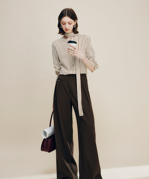 ストライプ柄のボウタイブラウスは、リボン結びにすればきちんと感のあるきれいめスタイルに、あえて垂らしてスカーフのようにアレンジすればこなれた印象に仕上がる一枚。結び方次第で表情が変わるので、オフィスからお出かけまで幅広く活躍し、シンプルなボトムスと合わせるだけでも上品な華やかさをプラスしてくれます。