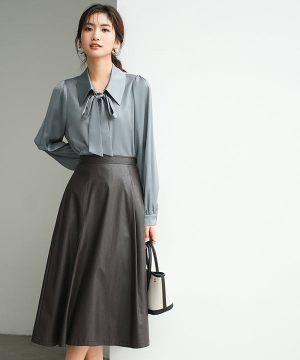 サテン素材の上品なツヤ感に、ふんわりとしたランタンスリーブが女性らしさを引き立てるボウタイブラウス。くすみブルーのやさしい色合いがフェミニンさときれいめ感を程よく両立してくれる一着です。