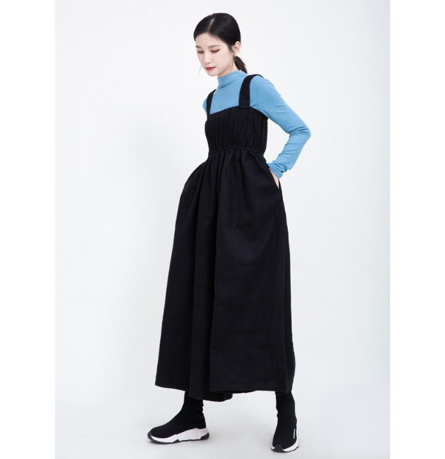 タートルネックやブラウスと合わせてジャンパスカートとして、夏になったら一枚で、ロングシーズン着回せるワンピースです。