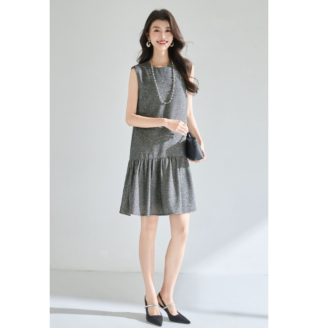 ローウエスト切り替えのシンプルなノースリーブワンピース。