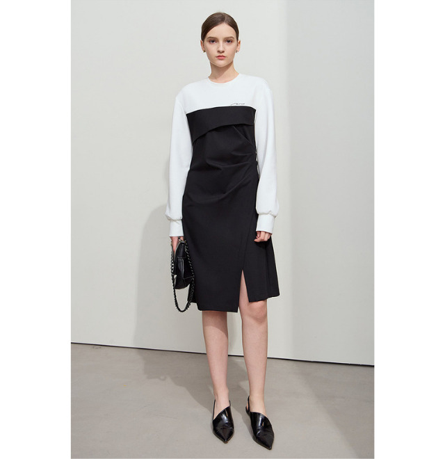 トレーナーみたいなカジュアルなトップスと、モードなジャンパースカートを合わせたようなモダンスタイルのワンピースです。
