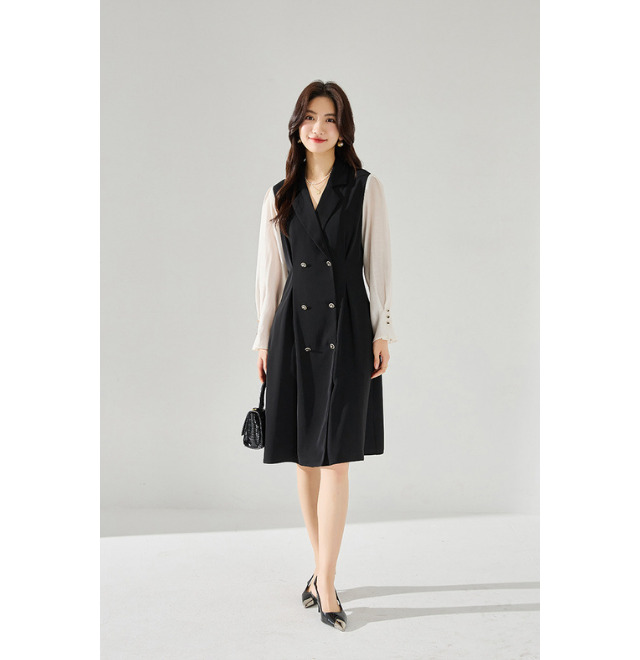 ダブルブレストテーラードのきちんと感と、柔らかなシフォンの袖が絶妙にマッチしたワンピース。