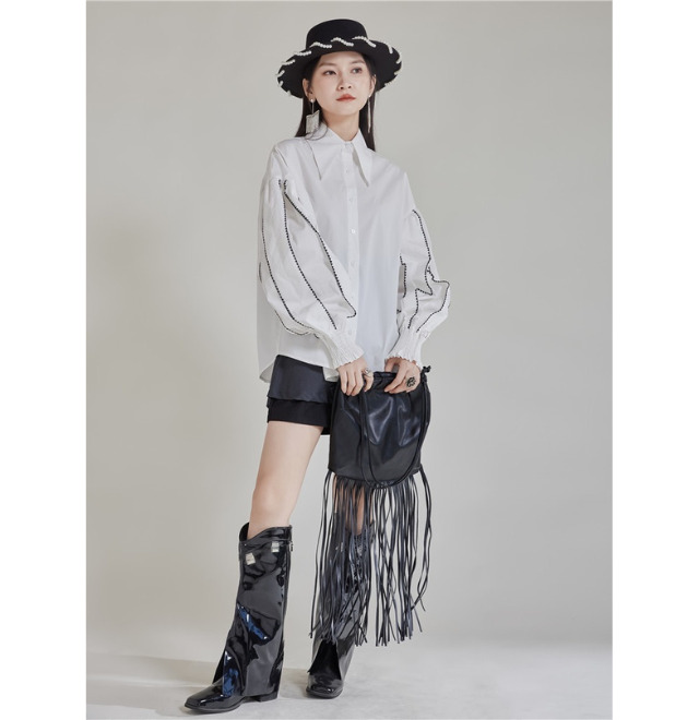 普通の白シャツだと顔周りが寂しく見える…そんなお悩みも、この襟コンシャスな一枚が解決します。モノトーンだからこそ際立つ、縁取りのラインがアクセント。