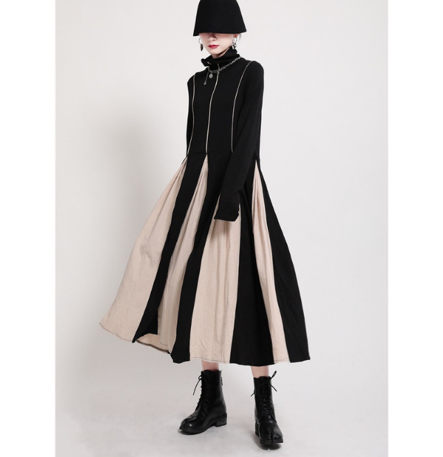 パッと目を引く大胆な切り替えデザインが特徴のブロッキングワンピース。