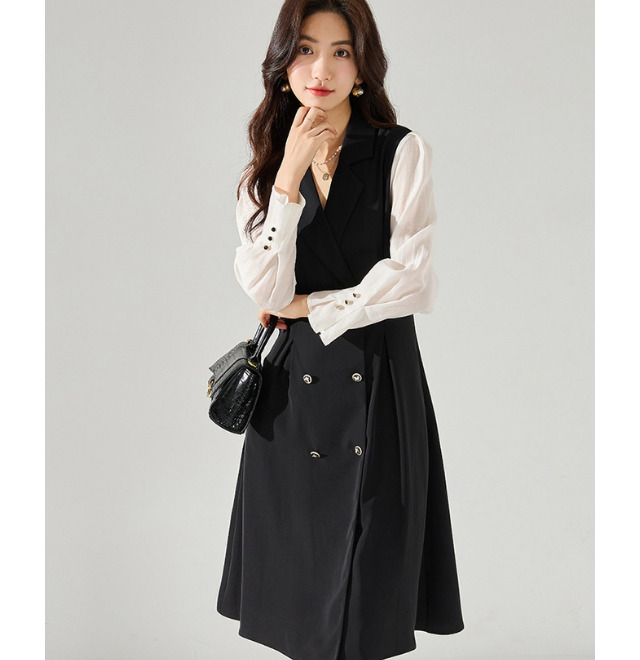 ブラウスにジレベストを重ねたようにも見えるレイヤードワンピース。