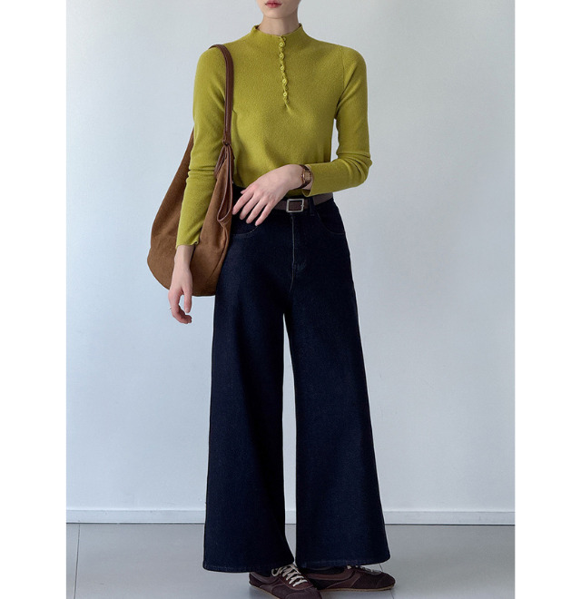 首元にあしらわれた小ぶりのボタンが、視線を中央に集めてスッキリとした縦のラインを強調。