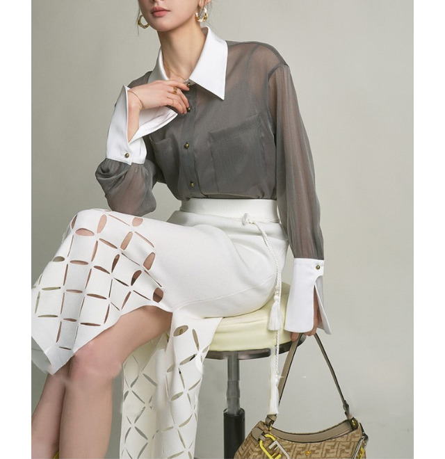 ボディやスリーブには、知的さとトレンドを醸し出すシアー素材のグレーを採用。