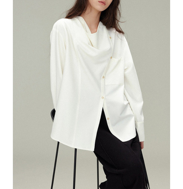 すっきりとしたノーカラーながら余裕を持たせた首元のドレープが