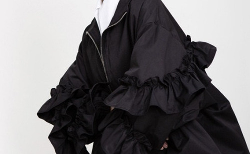 甘くなりがちなフリルも、大胆なフリルにキレのある黒だからモードな印象へと昇華。