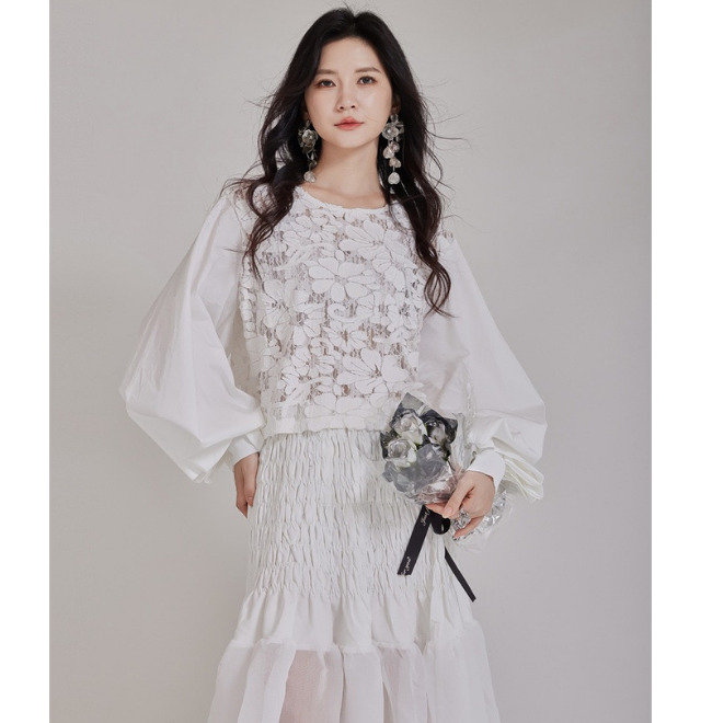 フラワーモチーフのカットオフレースがおしゃれなコットンブラウス。