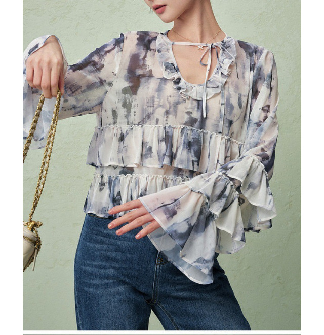 印象派の絵を切り取ったような柔らかなプリントのフリルブラウス。ジョーゼット生地の軽やかさとマッチしてとてもきれいですね。