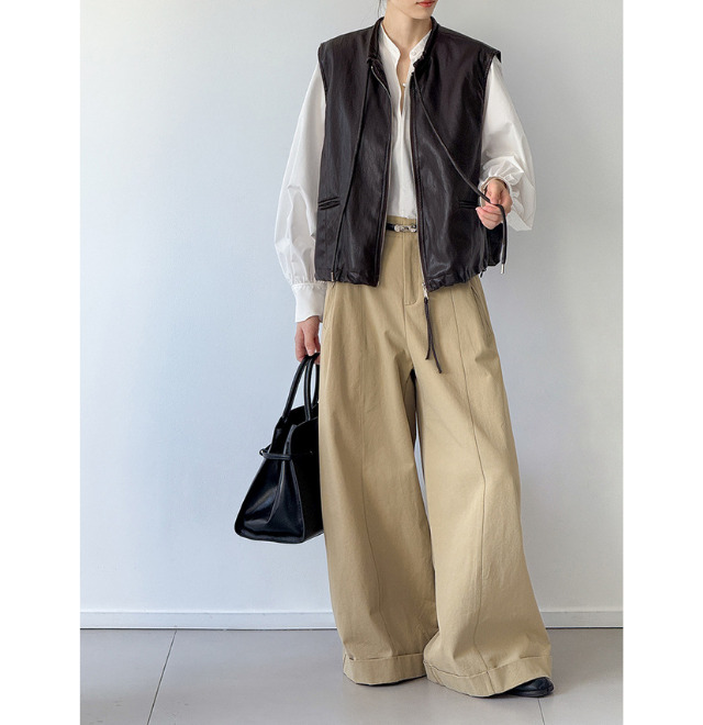 深いブラウンで高見えする素材の、フェイクレザーベスト。
