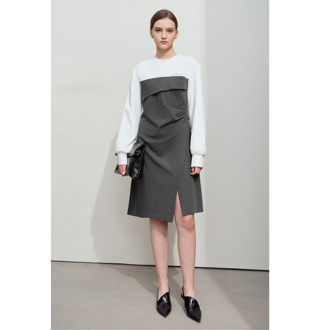 カジュアルなトレーナーデザインのトップに、モードなデザインスカートをドッキングした、テイストミックスのワンピース。