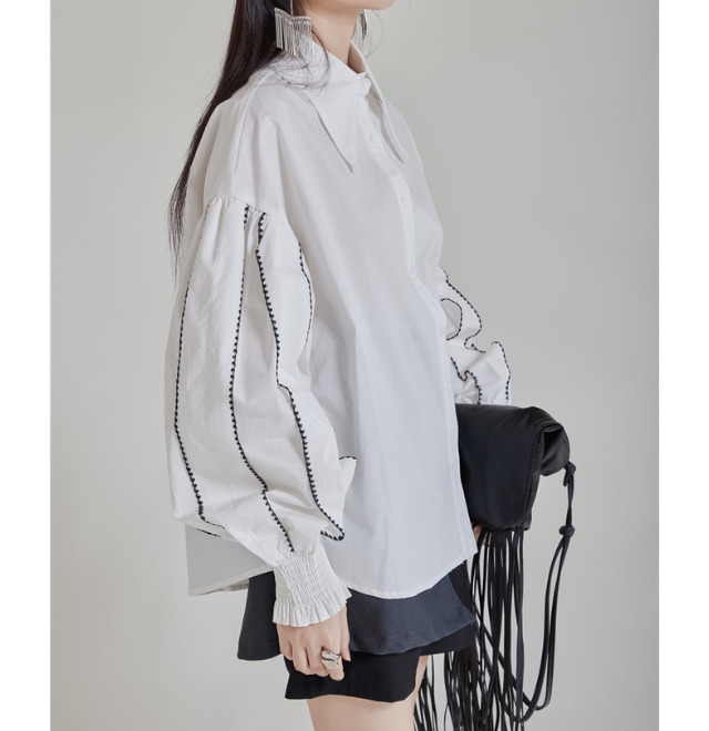 ボリュームスリーブにステッチが施されたデザインシャツ。