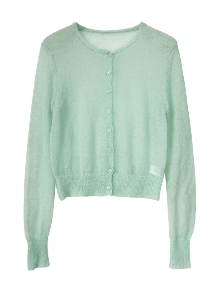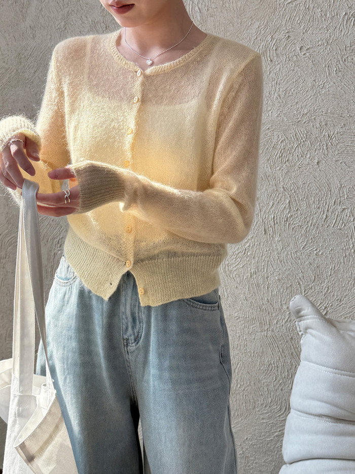 ふんわり柔らかなモヘア素材のシアーカーディガン。肌を明るく見せてくれるイエローです。