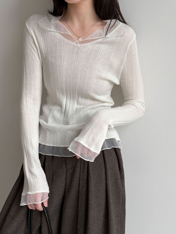 リブニットのカットソーにチュールシャツを重ね着したようなトップスです。ブラックのボトムスをあわせるだけで、異素材ミックスのおしゃれなワンカラーコーデが簡単に作れます。