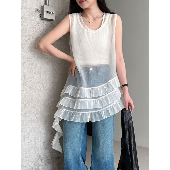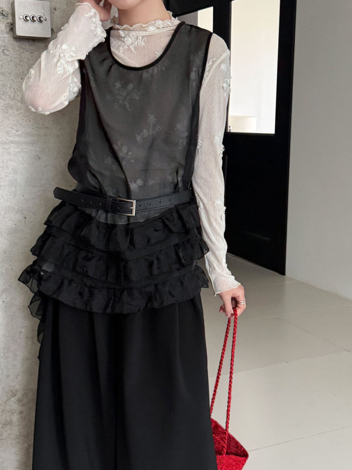 シアー素材のアシンメトリーワンピース。裾のフリルだけ見えるようにしたり、ワンピースの上に重ねたり、いろいろな着方を楽しみたいデザインです。