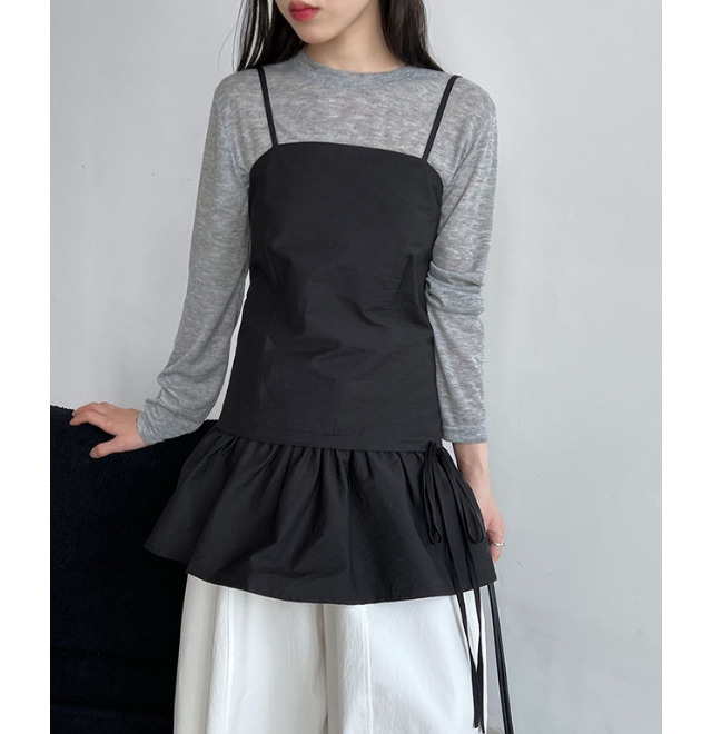キャミソールにフリルが付いたトップス。ダーツでウエストをシェイプして、ほっそり見えるシルエットです。