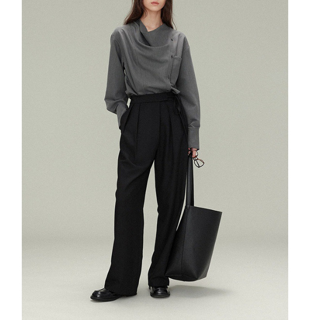 アシンメトリーなボタンと、ドレープ襟がアクセントになった、シックなグレーのシャツ。