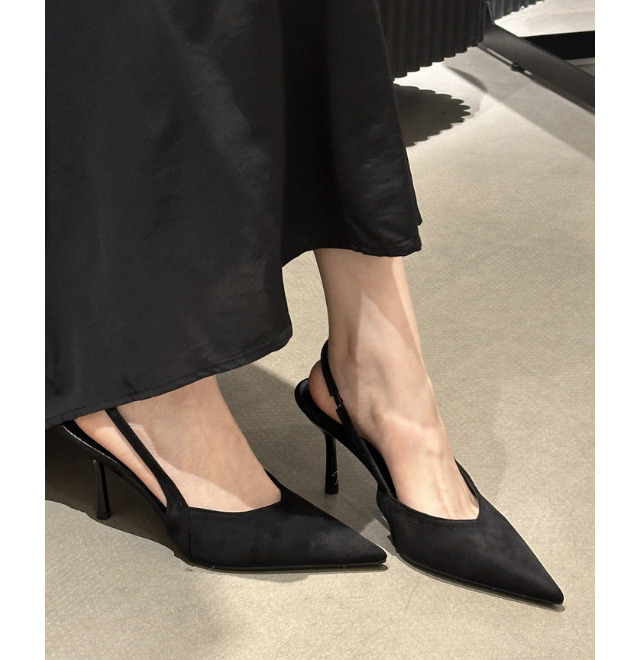 足元には「ポインテッドトゥバックベルトパンプス」