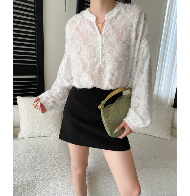 シャギー素材のフラワーデザインが目を惹くブラウス。