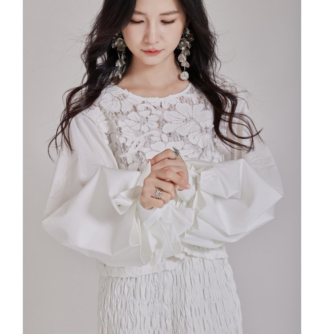 白のフラワーレースビッグスリーブシャツ