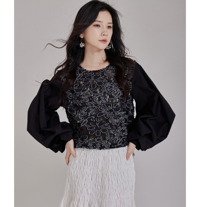 黒のフラワーレースビッグスリーブシャツ