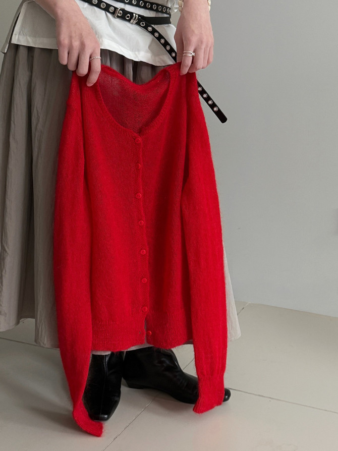 モヘアの柔らかなテクスチャーがレッドの強さをほどよく和らげ、華やかさの中に女性らしい温もりを添えてくれます。シンプルなブラックやデニムのコーデに羽織るだけで、一気に顔まわりが明るくなり、特別な日も普段使いも格上げしてくれる一枚。「赤は派手かな」と迷っている方にこそ、試してほしいカラーです。