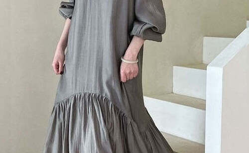 シアーな素材感のグレーがふんわりと揺れ、光の当たり方によって微妙に表情を変える繊細な美しさが魅力。すっきりとしたVネックとフィッシュテールの裾が、着る人のシルエットをスタイリッシュに整えながら、たっぷりとした裾フリルが女性らしいエレガントさをプラスします。